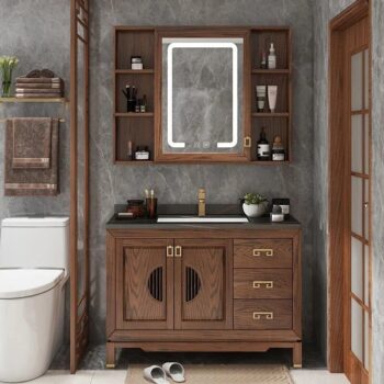 Elegant Vintage Oak Bathroom Vanity with Ceramic Sink and Slate Countertop