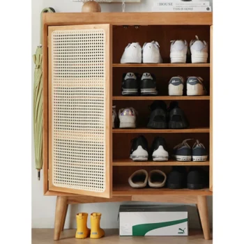 Large Capacity White Oak & Rattan Woven Shoe Cabinet