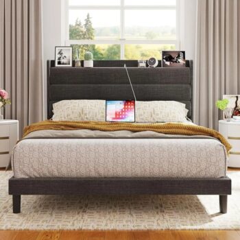 Queen Size Bed Frame with Storage Headboard & Built-In Outlets