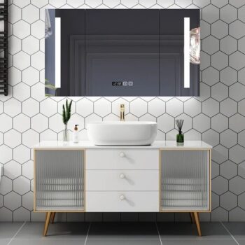 Modern White Oak Bathroom Vanity Set with Smart Mirror and Marble Countertop