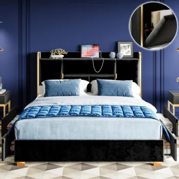 Upholstered Bed Frame with Charging Station and Storage Drawers